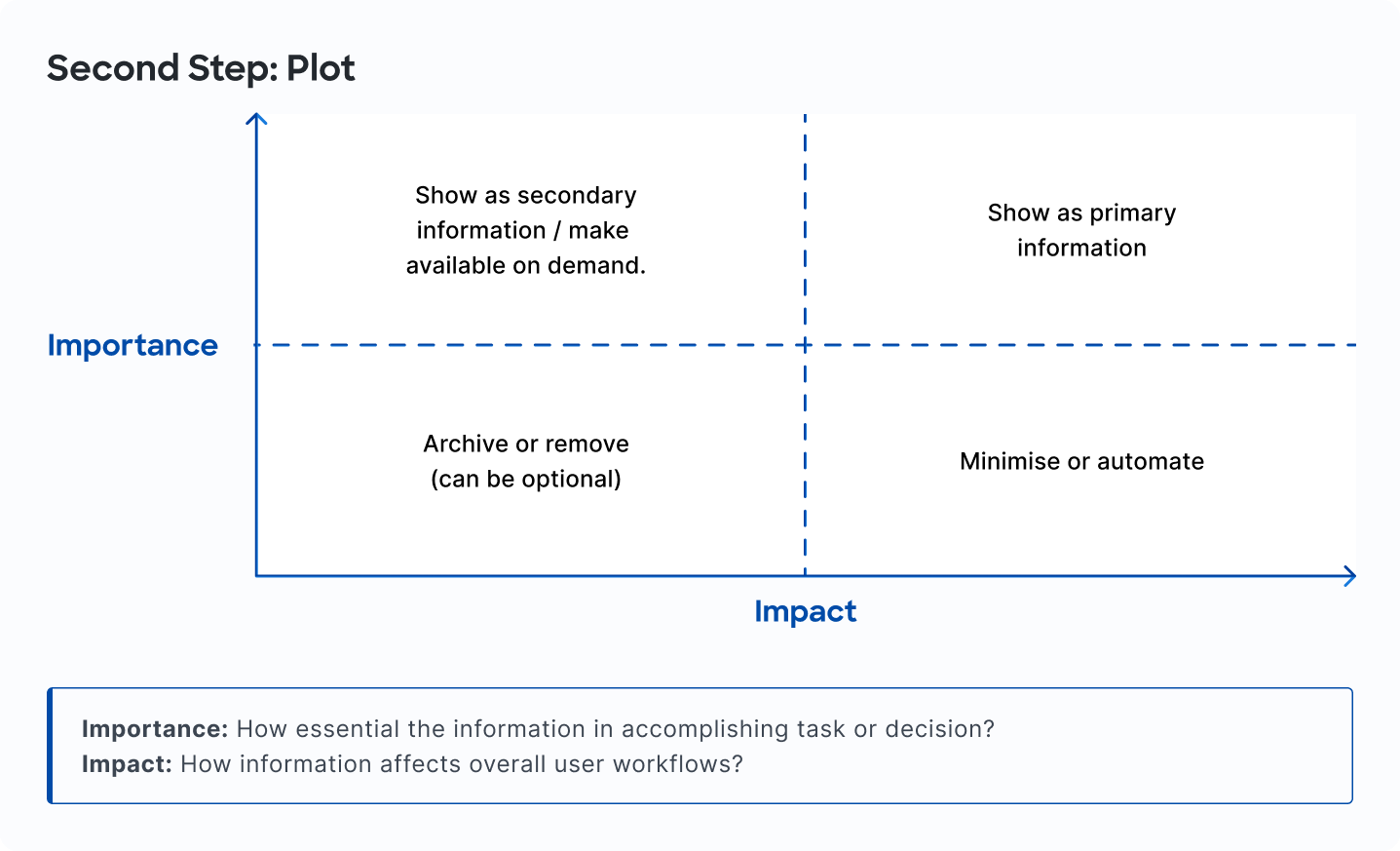 This step uses an Importance–Impact matrix to prioritize the information demands placed on the user by the agent. After cataloguing all information elements from the workload audit, each item is evaluated for its importance in task completion and its impact on the user’s broader workflow. Plotting these values on a structured matrix enables designers to distinguish essential, high-influence information from secondary or low-value elements. The matrix serves as a decision-support tool, guiding designers in restructuring information hierarchy, reducing cognitive noise, and ensuring that agent outputs align with what truly supports efficient and inclusive user performance.